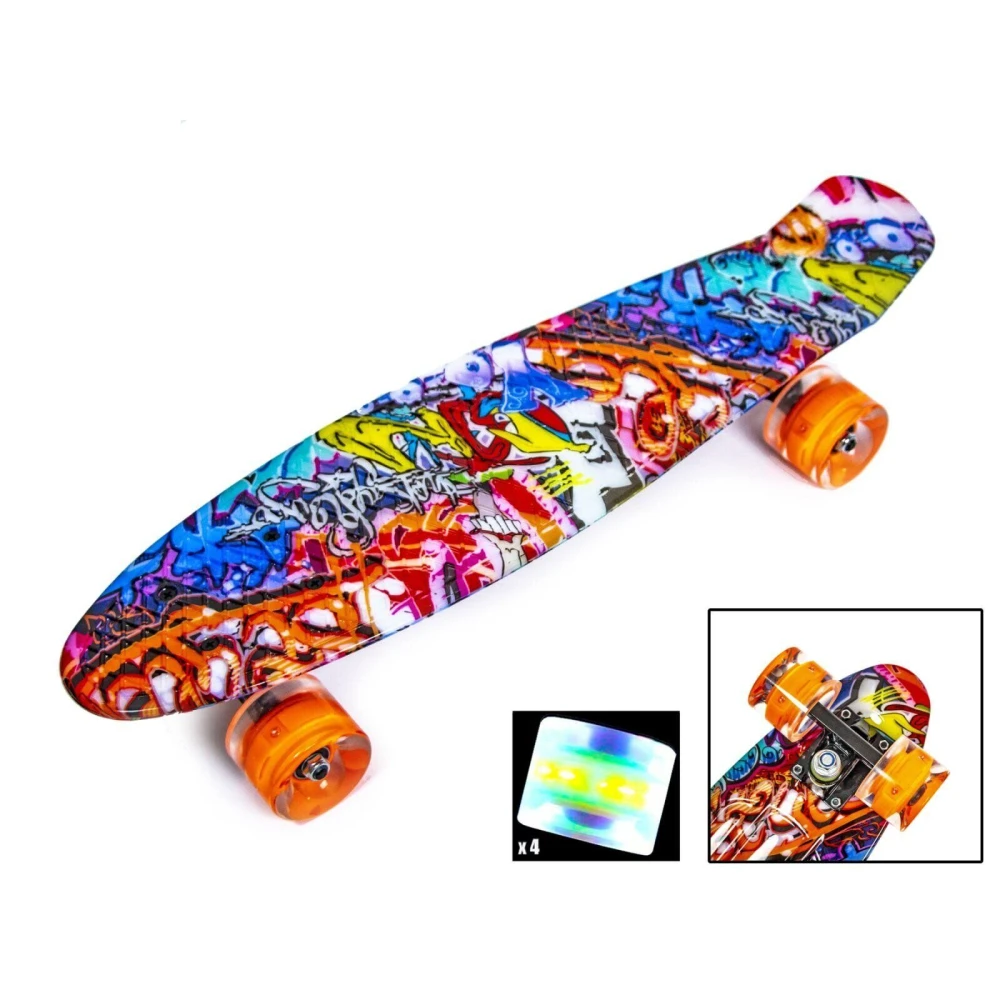 Пенни Борд с рисунком Zippy skateboards Ultra Led оранжевое граффити. Классный, яркий принт со светящимися колесами.