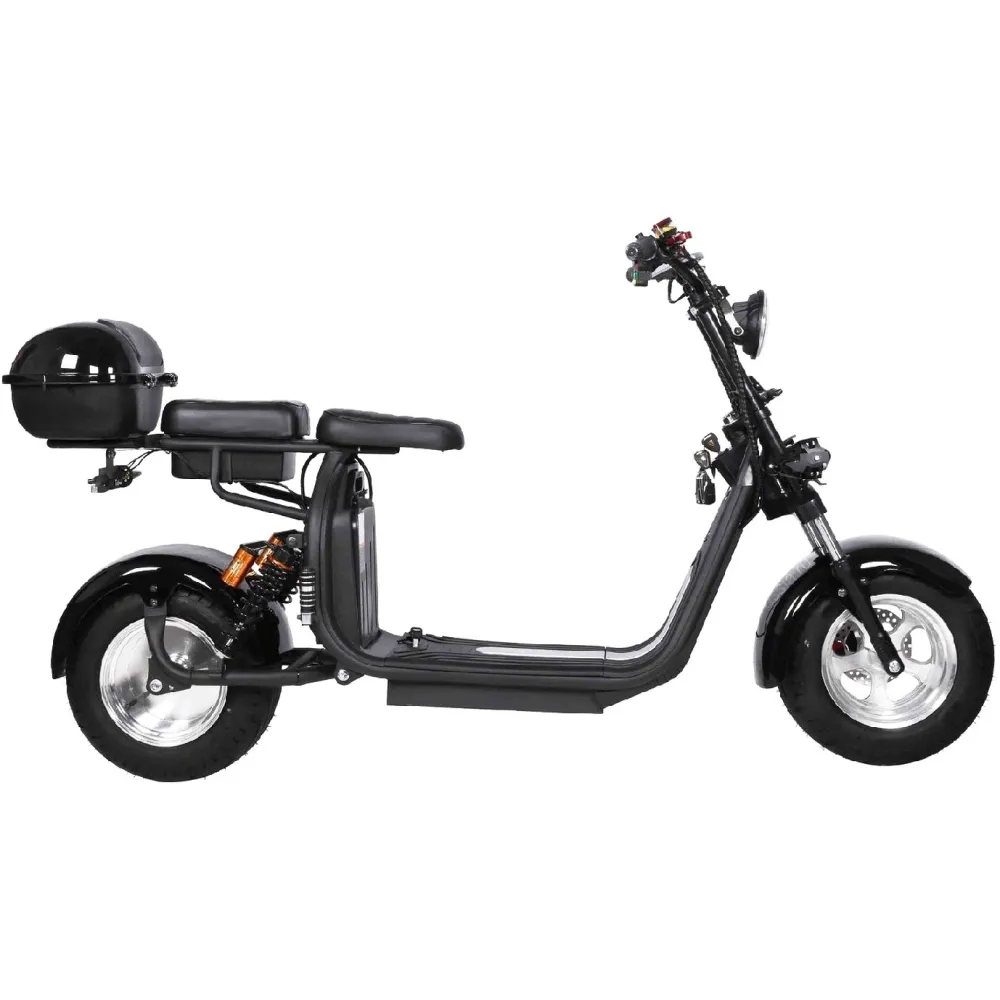 Электроскутер  Citycoco Kugoo C6 – обновленный вариант бренда занимает лидирующие позиции в продажах. Брутальный кричащий дизайн заинтересовал райдеров-экстремалов и любителей рыбалки. Широкая отлично сцепляемые шины обещают отличную проходимость и отсутствие проблем в дороге. Техника создана для езды по бездорожью, не разочарует при преодолении небольших препятствий и путешествии по лесным тропинкам.