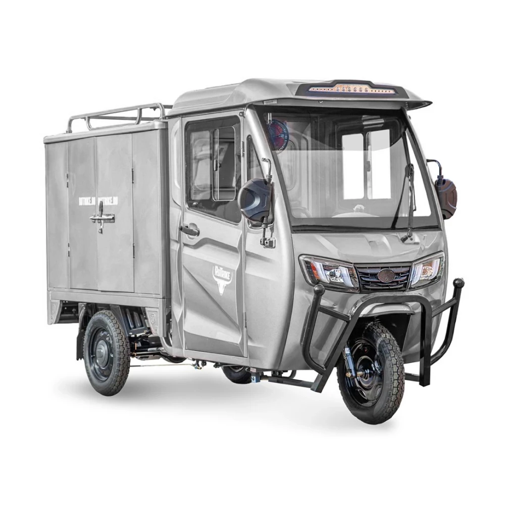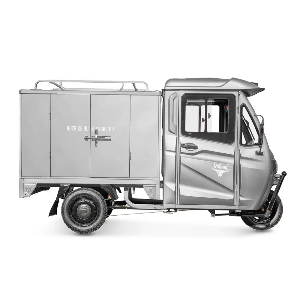 Грузовой электротрицикл Rutrike КАРГО Кабина Дуал серого цвета - это мощное и эффективное транспортное средство, которое предназначено для выполнения самых тяжелых задач перевозки грузов.