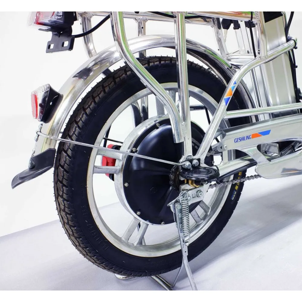 Техника имеет мощность – 350 Вт, надежную тормозную систему, не требующую применения силы. Качественный АКБ позволяет разгоняться до 35км/час и ехать на одной подзарядке до 40км. На этапе производства электровелосипеда производители позаботился об удобном мягком сидение, снижающим нагрузку на позвоночник, снимающим усталость со спины.